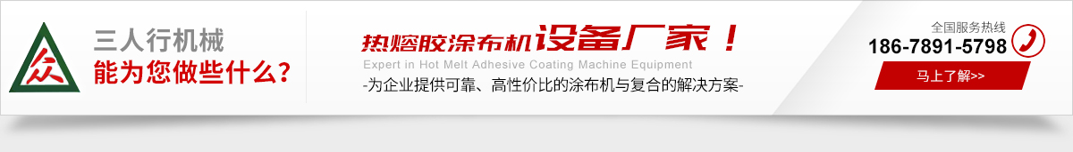 青島三人行機械有限公司是一家生產熱熔膠涂布機、不干膠涂布機、熱熔膠膜涂布機、膠帶涂布機、熱熔膠復合機。我們團隊擁有十余年熱熔膠涂布與復合的工藝經驗,無論是低粘度的熱熔壓敏膠(HM-PSA),還是高粘度的熱塑性材料(EVA、PU、PA、EEA等),我們能為您提供涂布與復合的合理解決方案。